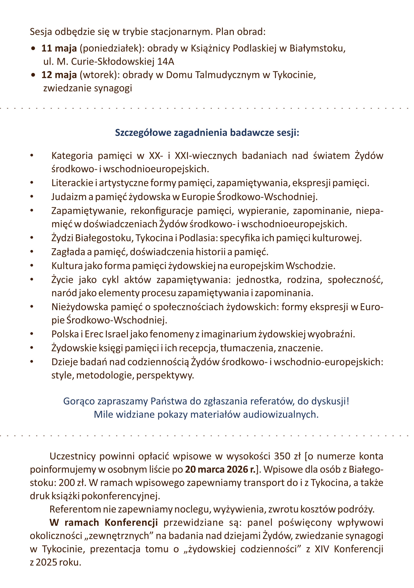 Główny Temat Konferencji: Sesja naukowa koncentruje się wokół zagadnienia: FORMY PAMIĘCI ŻYDOWSKIEGO ŚWIATA W EUROPIE ŚRODKOWO-WSCHODNIEJ.