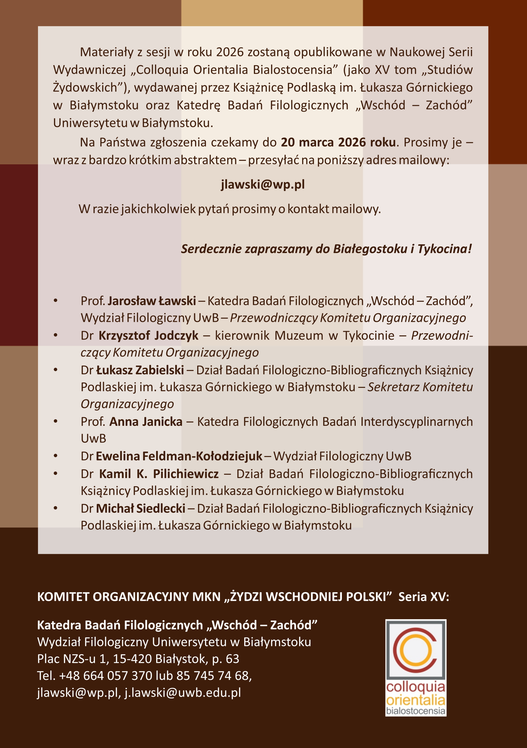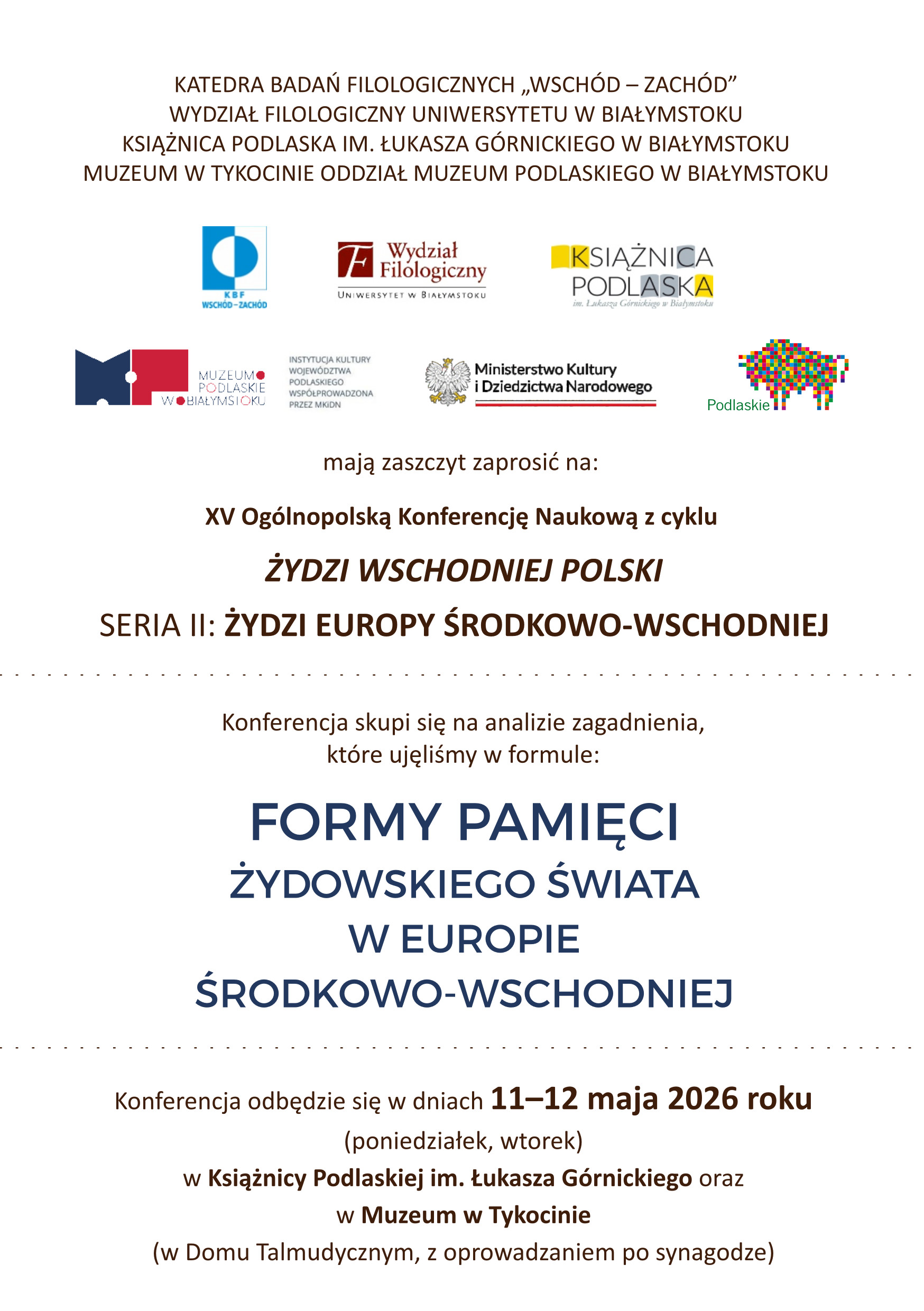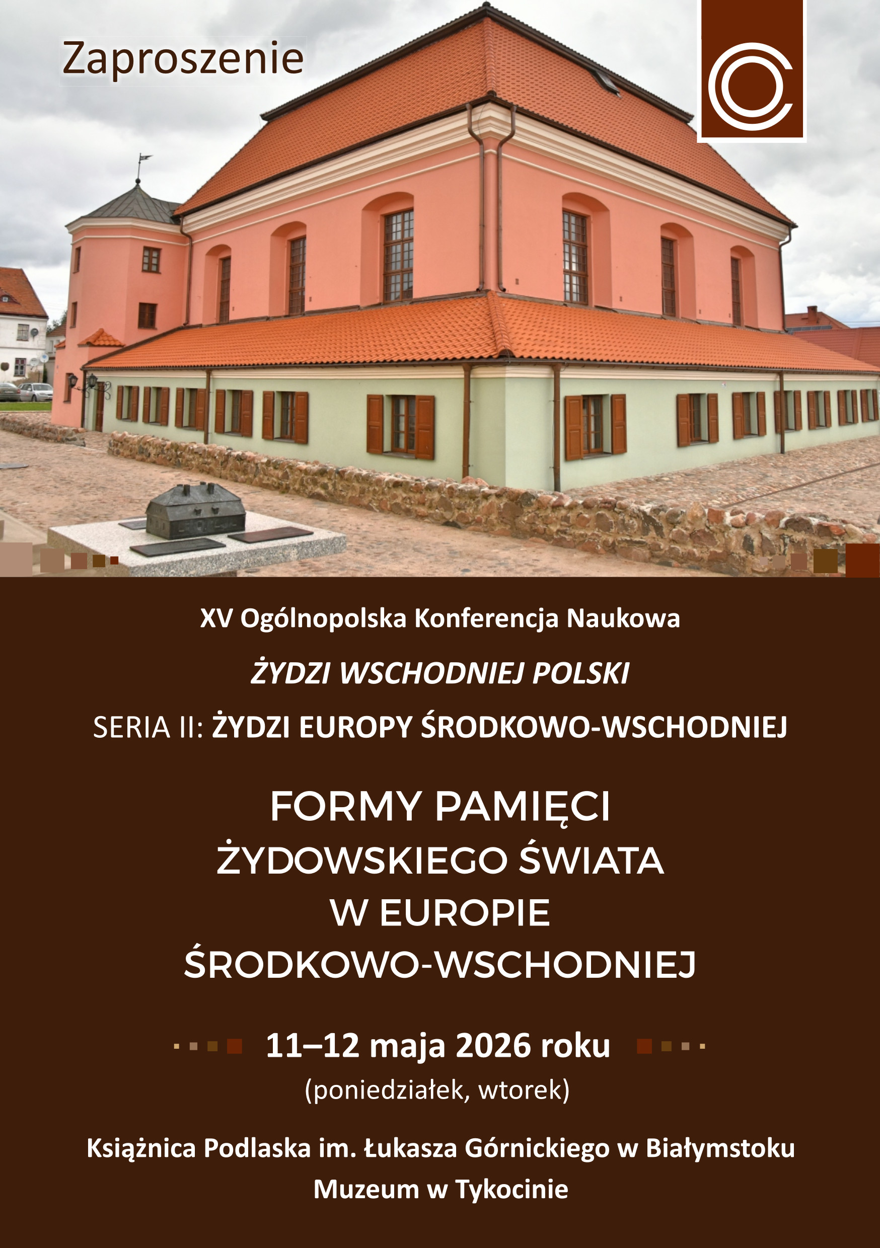 Serdecznie zapraszamy do udziału w XV Ogólnopolskiej Konferencji Naukowej z cyklu „Żydzi Wschodniej Polski”, której tegoroczna Seria II poświęcona jest zagadnieniu „Żydzi Europy Środkowo-Wschodniej”. To kluczowe wydarzenie naukowe, skupiające się na analizie i dyskusji wokół najnowszych badań nad żydowską historią, kulturą i pamięcią w regionie Europy Środkowo-Wschodniej, odbędzie się w dniach 11–12 maja 2026 roku.